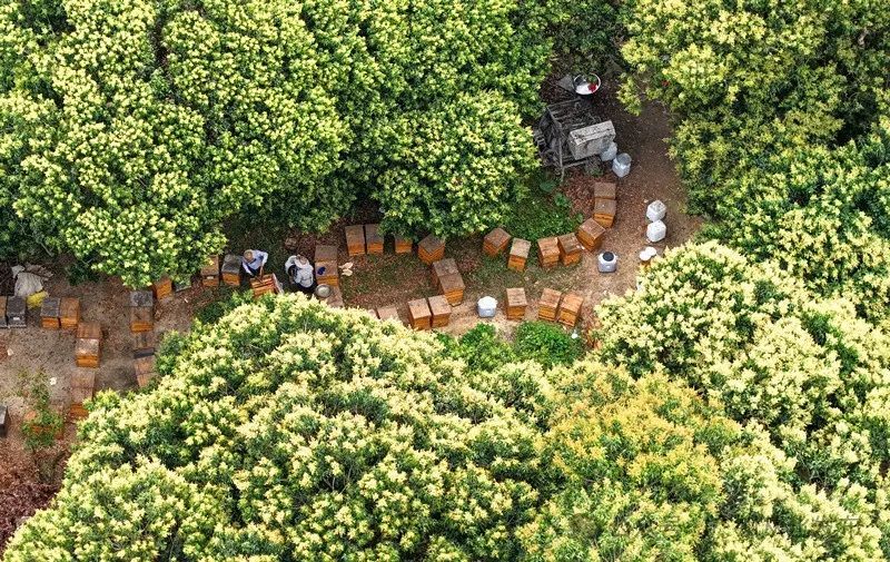 正如杨朔笔下所描绘的那般,“从化的荔枝树多得像汪洋大海,开花时节,那蜜蜂满野嘤嘤嗡嗡,忙得忘记早晚,有时还趁着月色采花酿蜜。”四月的从化荔枝确实如此,花蜜枝头凝聚,蜜蜂纷飞作响。从化的荔枝多为几十亩至几百亩连片种植,荔枝花开,蜜蜂追来,更吸引了一批批养蜂人来从化安营扎寨,打蜜、过滤、装桶……勤劳的蜜蜂外出开始新一天的采蜜,而这群勤劳的养蜂人也会忙着采收荔枝蜜。